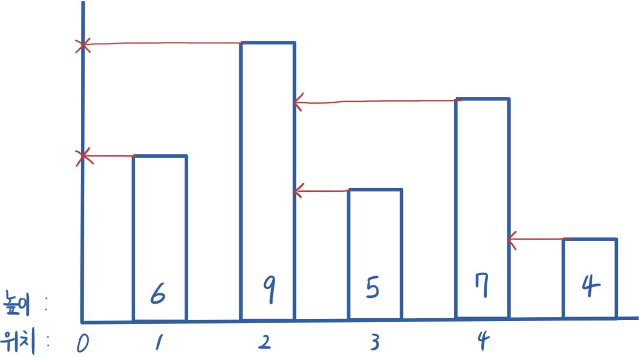 stack의 top 값 (= 이전 탑의 길이) > 현재 탑의 길이