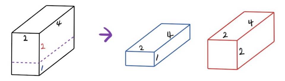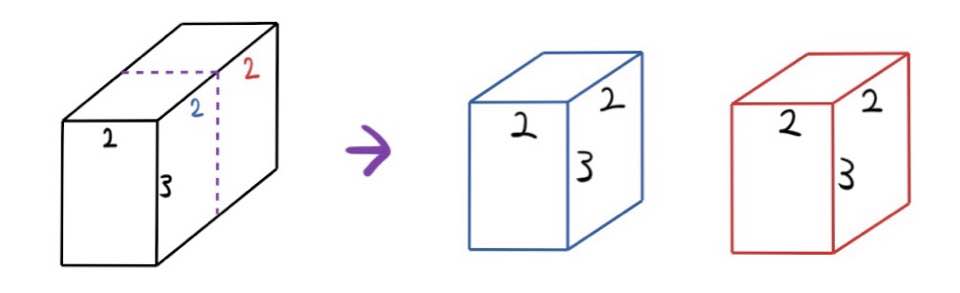 이렇게 그림에 나와있는 것처럼 직육면체를 두 조각으로 자르는 것에 주목해보자