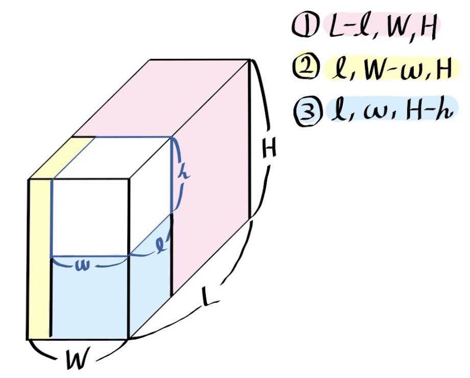 그림과 같이 현재 가장 큰 큐브 l, w, h를 제외하고 남은 1번, 2번, 3번 상자들은